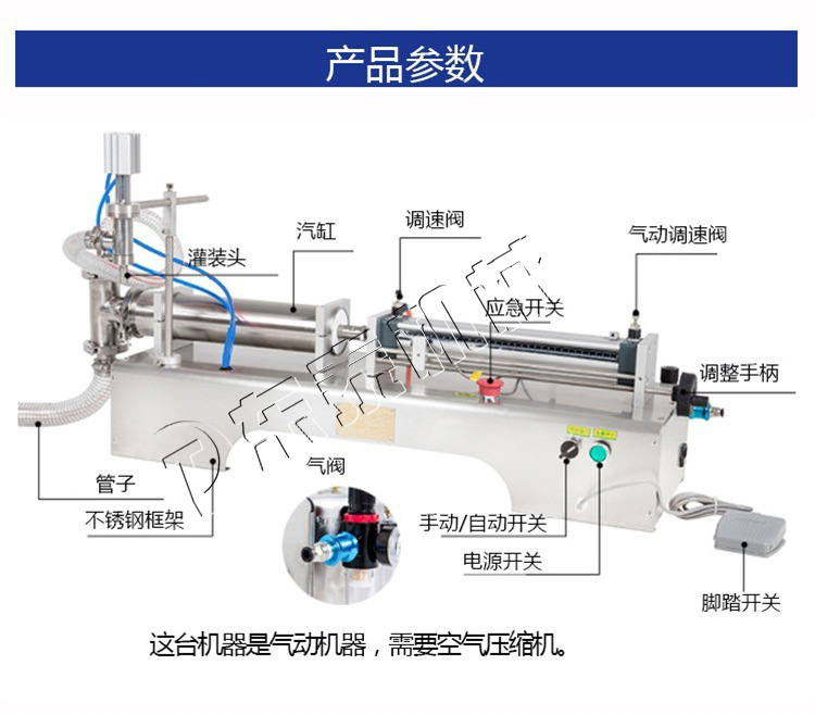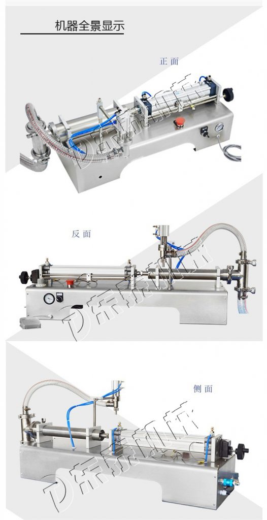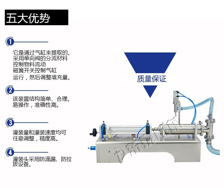 小型液體定量灌裝機(jī),通過(guò)氣缸帶動(dòng)一個(gè)活塞來(lái)抽取和打出物料,用單項(xiàng)閥控制物料流向,小型液體定量灌裝機(jī)用磁簧開(kāi)關(guān)控制氣缸的行程,即可調(diào)節(jié)灌裝量。